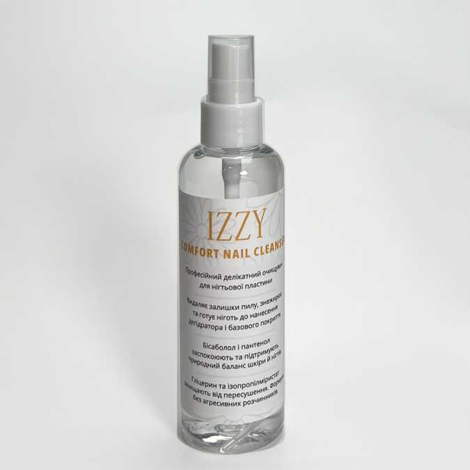 Забезпечте ідеальну адгезію та максимальну стійкість вашого манікюру з Делікатним очищувачем Izzy Comfort Nail Cleanser (100мл). Цей засіб спеціально розроблений для бережного та ефективного видалення забруднень і залишків жиру з нігтьової пластини перед нанесенням дегідратора та бази. Очищувач IZZY є важливим кроком у професійній підготовці, гарантуючи, що покриття триматиметься без відшарувань. Бренд IZZY — це преміум-продукція, що ретельно тестується на носибельність та зручність у роботі перед виходом на ринок. Наш 15-річний досвід у сфері обслуговування та навчання майстрів дозволяє створювати матеріали найвищої якості, яким можна довіряти. Уся продукція IZZY сертифікована в Україні та виготовлена без високотоксичних компонентів, що гарантує максимальну безпеку та комфорт для вас і ваших клієнтів. Купуючи IZZY, ви отримуєте якість без компромісів та можливість вдосконалювати свої навички.